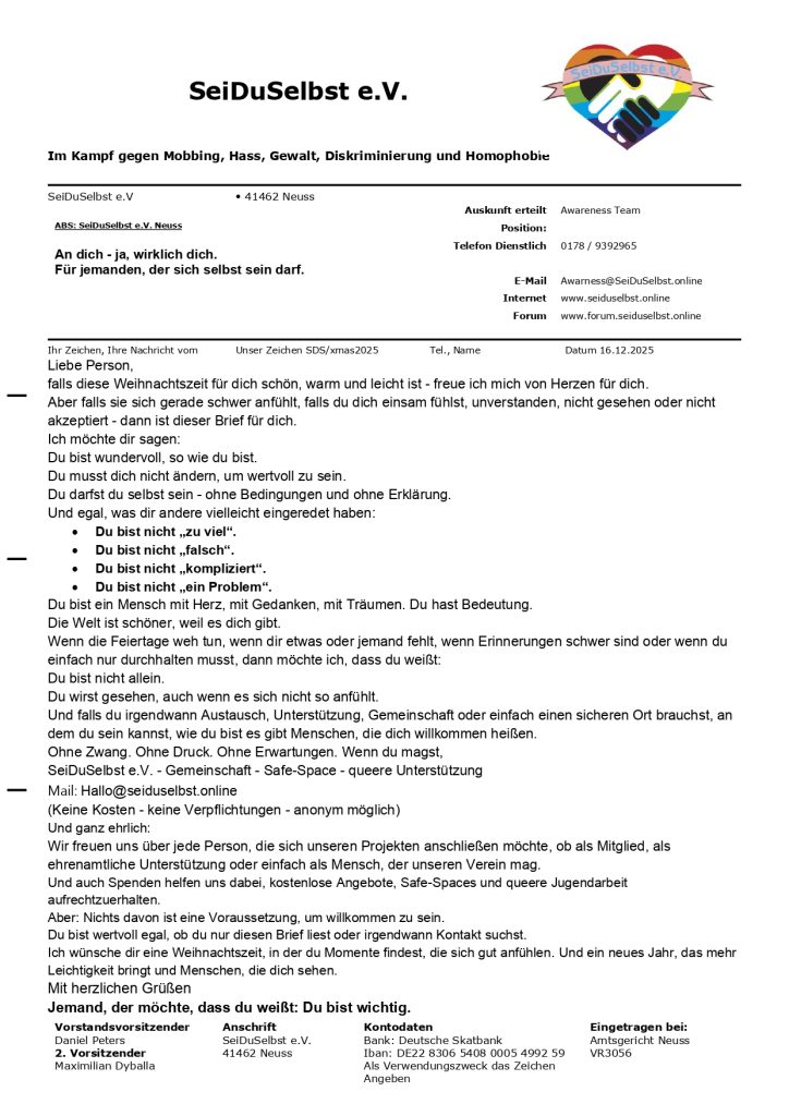 Aus diesem Grund haben wir von SeiDuSelbst e.V. auch in diesem Jahr unsere Weihnachtsbriefaktion umgesetzt.
